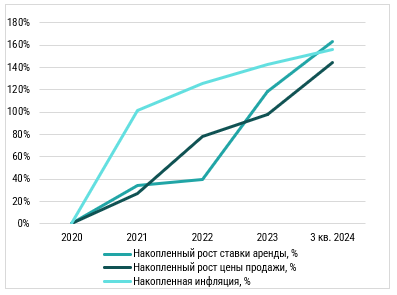 С 2023 г. цена продажи растет более сдержанными темпами (+39%), чем ставки аренды (+44%). Более того, с 2021 г. накопленный рост ставок аренды впервые превысил инфляцию в отличие от цены продажи. В условиях удорожания кредитного финансирования и рынка собственника, продажа является более привлекательным видом сделки как для девелоперов, так и для покупателей из-за фиксации условий и снижения инфляционных рисков