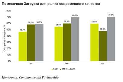 После весьма скромных результатов 2022 года, в течение которого рынок отелей современного качества увеличился всего на 340 номеров (Soluxe Hotel Moscow), в 2023 году ожидается открытие почти 900 новых номеров — в основном, в сетевых проектах различного ценового стандарта, чье открытие было перенесено с 2022 года на более поздние сроки ввиду необходимости замены бренда или полного отказа от него. В 1 квартале текущего года состоялось открытие первого отеля из семи ожидаемых — AZIMUT Moscow Comcity (150 номеров, ex.Novotel).