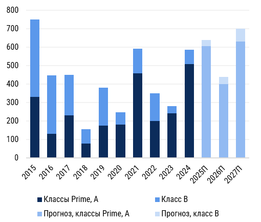 В 2026 году прогноз по новому строительству — 440 000 м². Несмотря на ожидаемое снижение ключевой ставки, влияние этого фактора будет отложенным. В 2027 году новое строительство может достичь 700 тыс. м², что будет свидетельствовать о поэтапном восстановлении рынка.